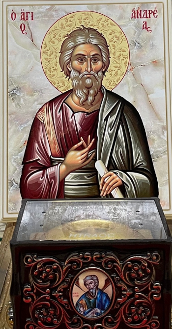 O a doua dorință sfântă a comunității a fost aducerea spre veșnică și permanentă închinăciune a Sfintelor Moaște ale Ocrotitorului României, Sfântul Apostol Andrei — Cel Întâi Chemat, Apostolul Românilor, Luminătorul strămoșilor noștri — care, prin prezența sa la biserica noastră, a devenit și Ocrotitorul Californiei.