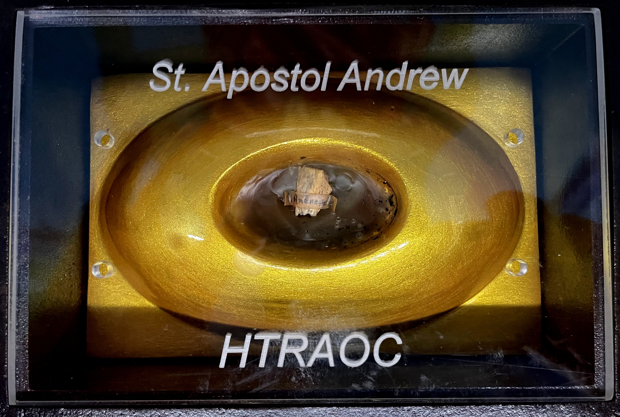 O a doua dorință sfântă a comunității a fost aducerea spre veșnică și permanentă închinăciune a Sfintelor Moaște ale Ocrotitorului României, Sfântul Apostol Andrei — Cel Întâi Chemat, Apostolul Românilor, Luminătorul strămoșilor noștri — care, prin prezența sa la biserica noastră, a devenit și Ocrotitorul Californiei.